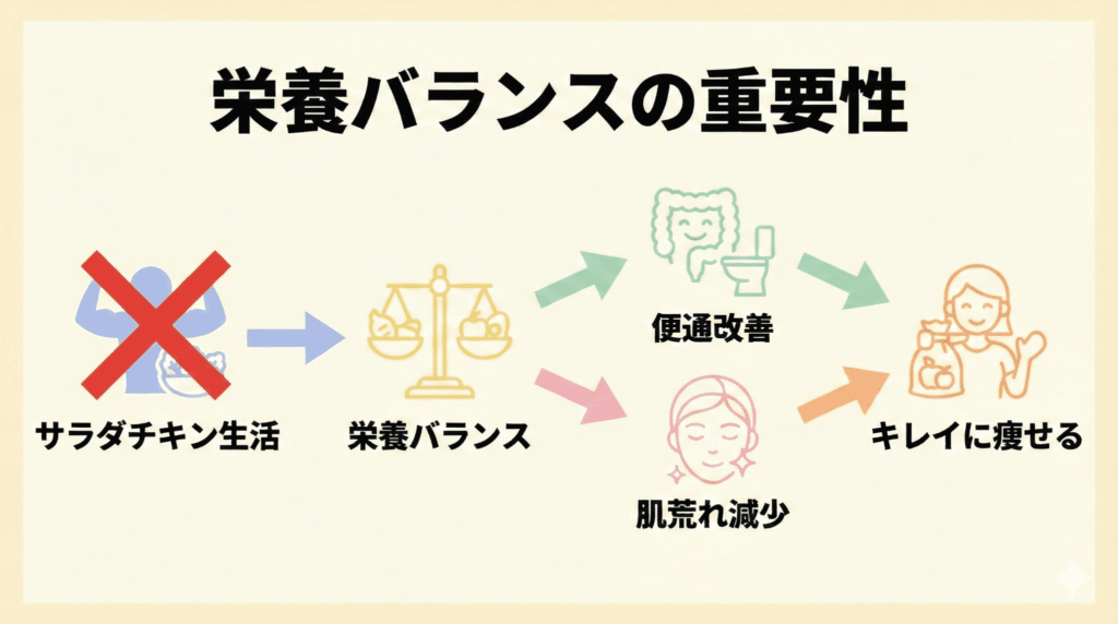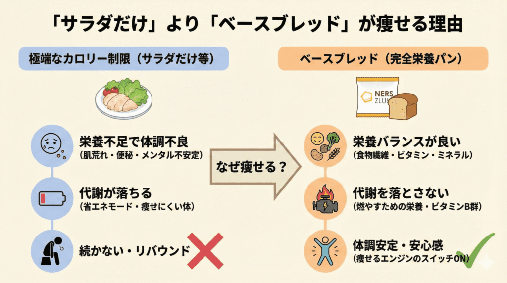 極端なカロリー制限(サラダだけ等)は、体の代謝を落として「省エネモード(痩せにくい体)」を作ってしまいます。