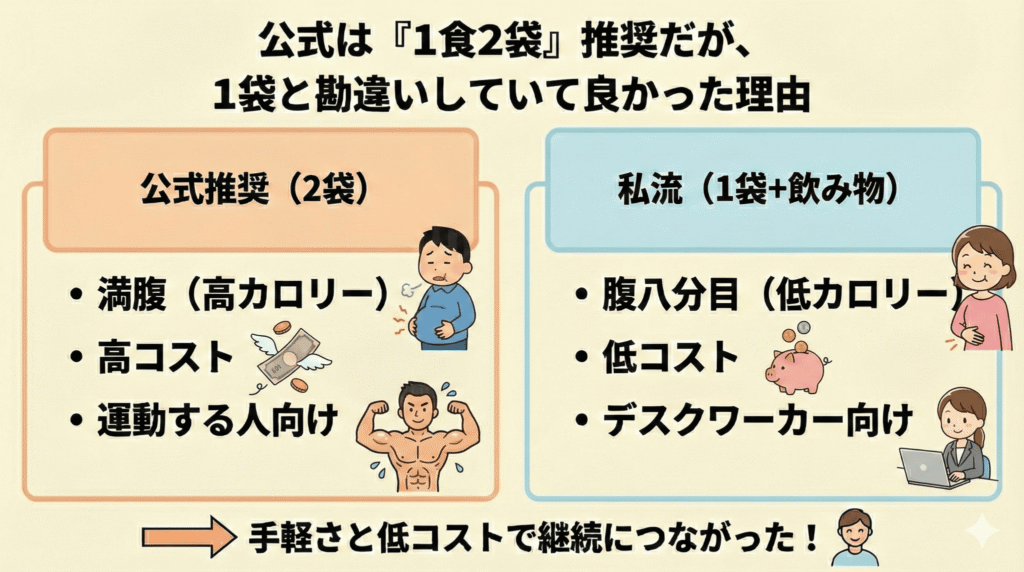 公式は「1食2袋」推奨だが、1袋と勘違いしていて良かった理由