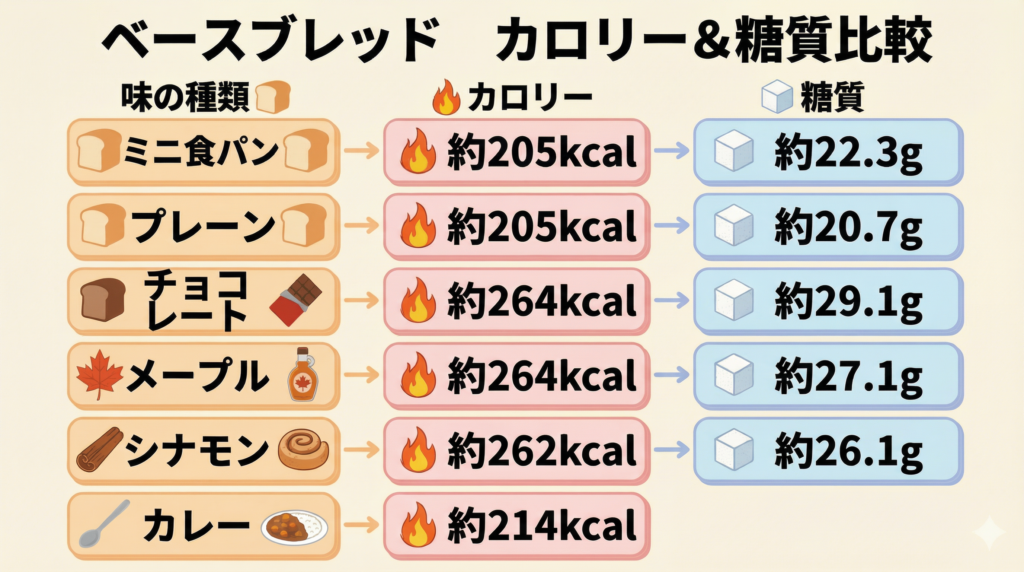 - ベースブレッド全種類の正確なカロリー・糖質データ