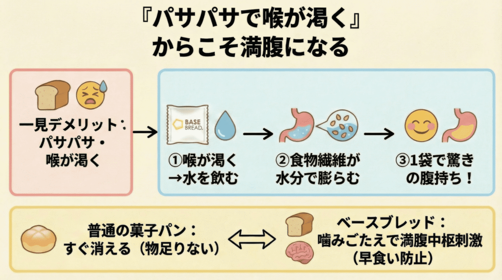 ベースブレッドの口コミでよく見かけるのが「水分が少なくてパサパサする」「喉が渇く」という意見があります。