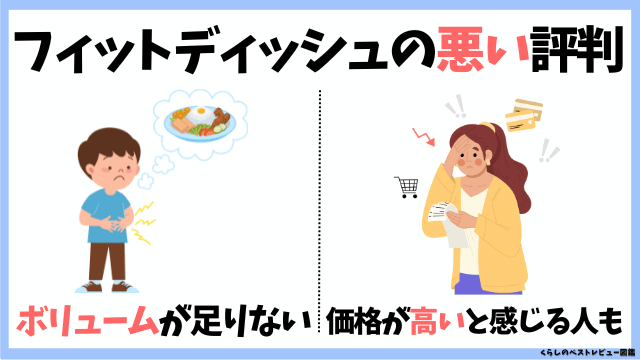 続けやすく健康的な一方で、フィットディッシュを利用した一部ユーザーからは「ボリューム」「コスパ」面でネガティブな口コミも見られます。