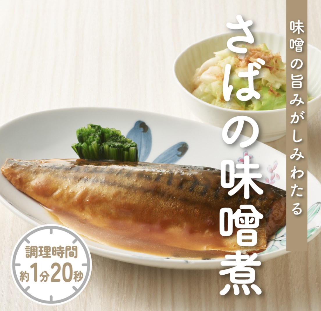 | メニュー例 | さばの味噌煮 | ハンバーグ | 野菜とがんもどき | 鮭のレンジ蒸し |