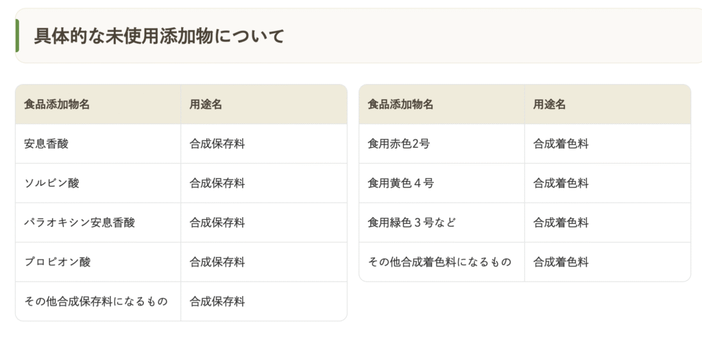 | 安心感 | 国産+低添加物・アレ表示も充実 | 原材料・アレ表示・無添加で安心 |