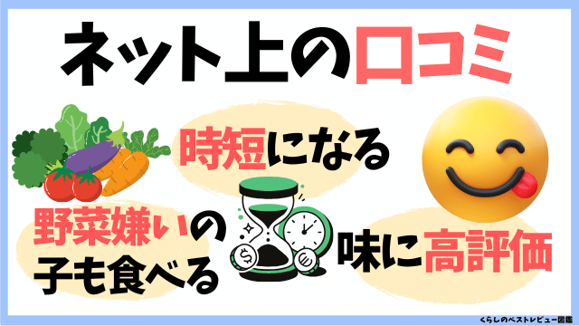 | 実感 | 「共働きでも毎日献立に悩まなくなった」 「副菜追加も朝食やお弁当に使いやすい」 | 「子どものご飯作りにイライラしなくなった」 「家族分まとめてすぐ完成」 |