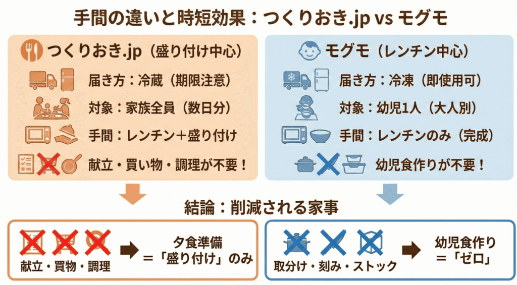 手間の違い:モグモはレンチン中心、つくりおき.jpは盛り付け中心でどれだけ時短できるか