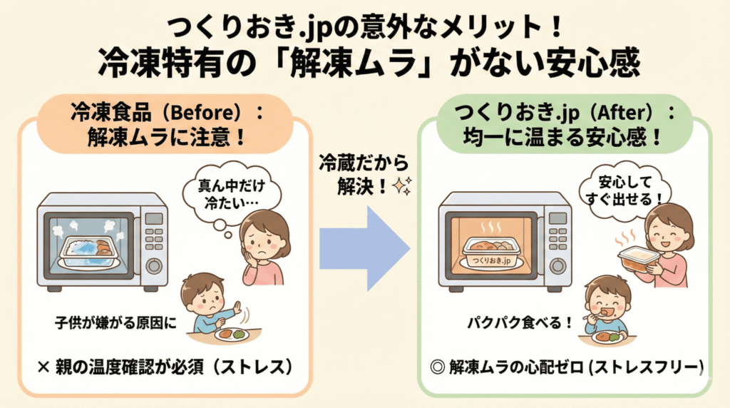 - つくりおき.jp(冷蔵): 均一に温まるので、「解凍ムラ」の心配ゼロ。