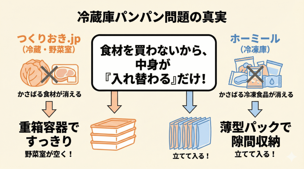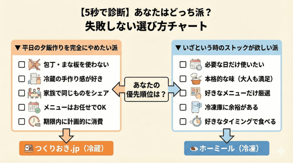 | 使い方 | 平日の夕飯を「完全置換」 (買い物も料理もやめる) | 忙しい日や休日の「レスキュー食」 (あると精神安定剤になる) |
